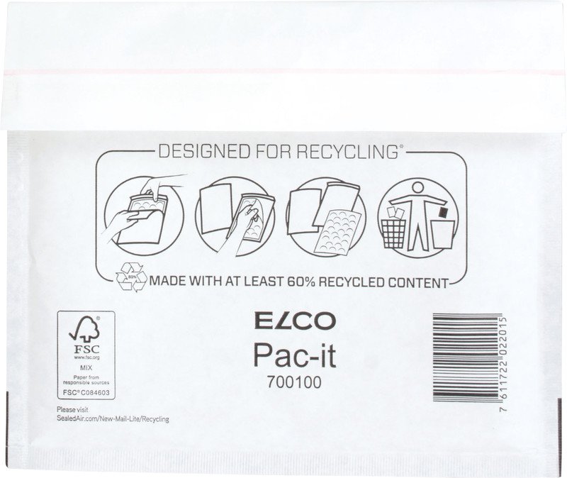 aus 60% recyceltem Material, weisse Versandtasche mit Luftpolster für den Versand von empfindlichen Gegenständen, bag-in-bag System mit herausnehmbarer Innentasche, Aussentasche 100% recycelbar. Zertifikat: FSC.