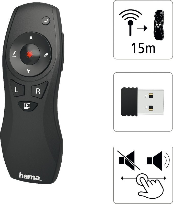 HAMA Wireless-Laser-Presenter X-Pointer 6 in 1 schwarz kabellose Präsentierhilfe, 2,4-GHz-Technologie, geeignet für Präsentationen mit PowerPoint®, Keynote®, Acrobat®, Google™ Slide und Prezi™ sowie für Videokonferenzen mit Zoom®, Microsoft Teams® und Blue Jeans, mit dem Dongle steuerbar, Hervorheben-Funktion: erzeugt einen roten Scheinwerfer-Effekt auf dem Bildschirm, Vergrössern-Funktion: Details vergrössert darstellen, Digitale Laser-Funktion: Informationen direkt und präzise aufzeigen, Air-Maus-Funktion, Digital Ink für digitales schreiben, Lautstärkeregelung, Full-Screen/Black-Screen auf Knopfdruck, Reichweite 15 m, Laser-Klasse 1, ist kein Laserpointer. Im Lieferumfang enthalten: Dongle, Bedienungsanleitung. Stromversorgung: 2 Batterien AAA (mitgeliefert). Systemvoraussetzungen: Windows® 7 oder höher; Mac OS X 10.10 oder höher. Masse: B 45 x H 121 x T 30 mm. Gewicht: 89 g. Preis inkl. VRG.