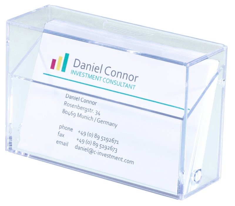aus glasklarem Hartplastik, für bis zu 100 Visitenkarten bis Format 86 x 56 mm.